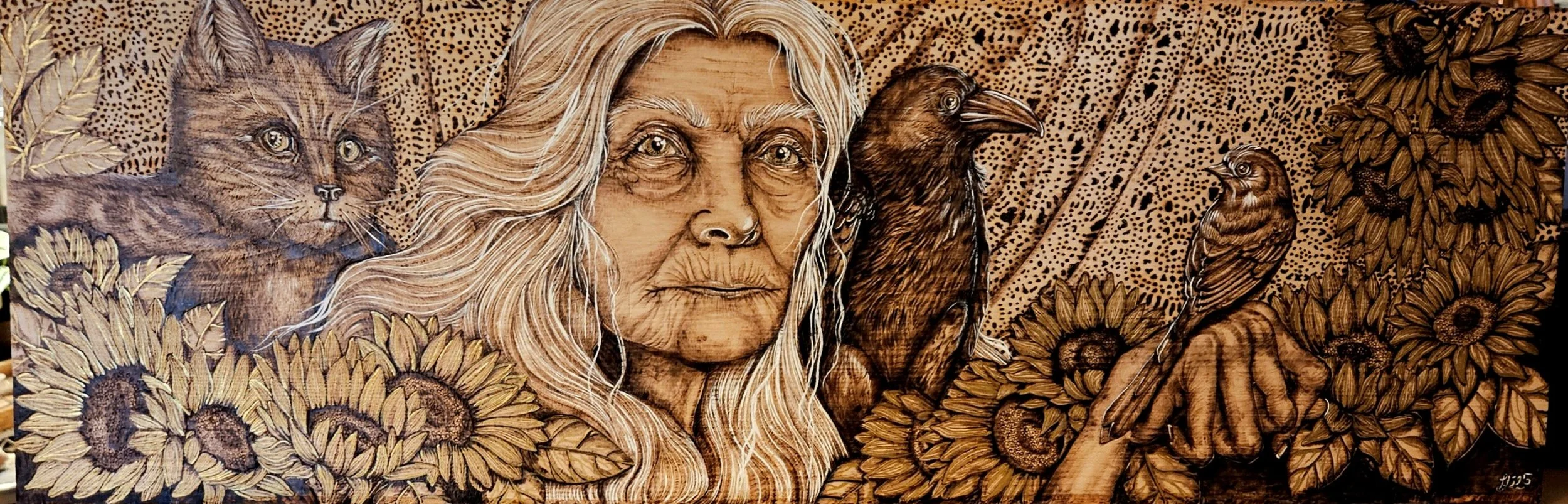 36x12”, Pyrography with acrylic on live-edge birch. $950