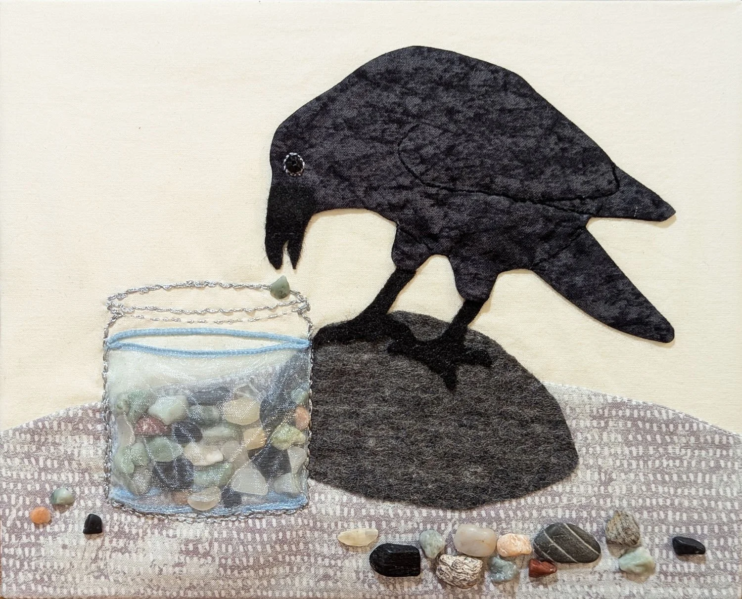 8×10”, Mixed media: fabric, embroidery & stones, framed. $129