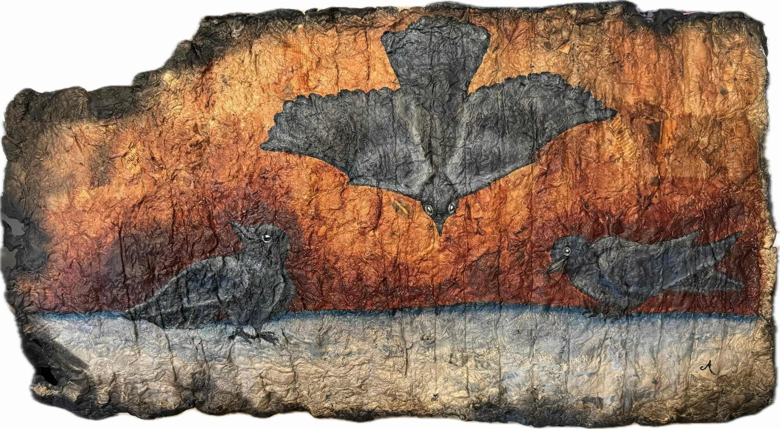 44×28”, Acrylic and fire on handmade paper (from newspaper). $600
